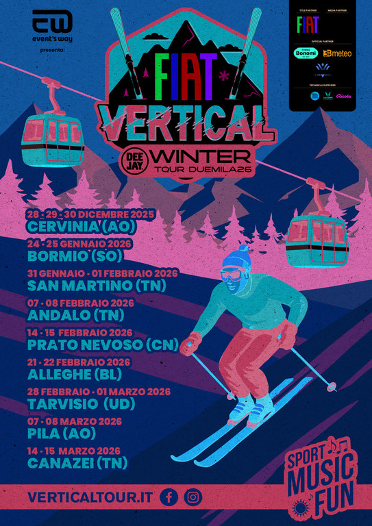 Prima grande novità con FIAT, che sarà protagonista come title partner del tour invernale più seguito e atteso nelle principali località sciistiche italiane: il Vertical Winter Tour, in collaborazione con Radio Deejay. Un evento unico che trasforma la neve in un grande villaggio di musica, divertimento e sport.