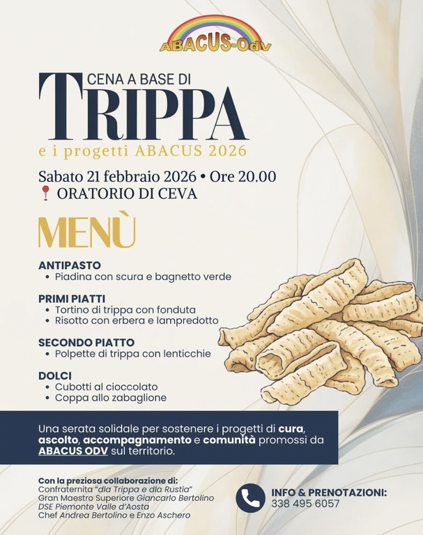 È questo lo spirito della Cena a base di trippa organizzata da ABACUS ODV, in programma sabato 21 febbraio alle 20 presso l’Oratorio di Ceva.