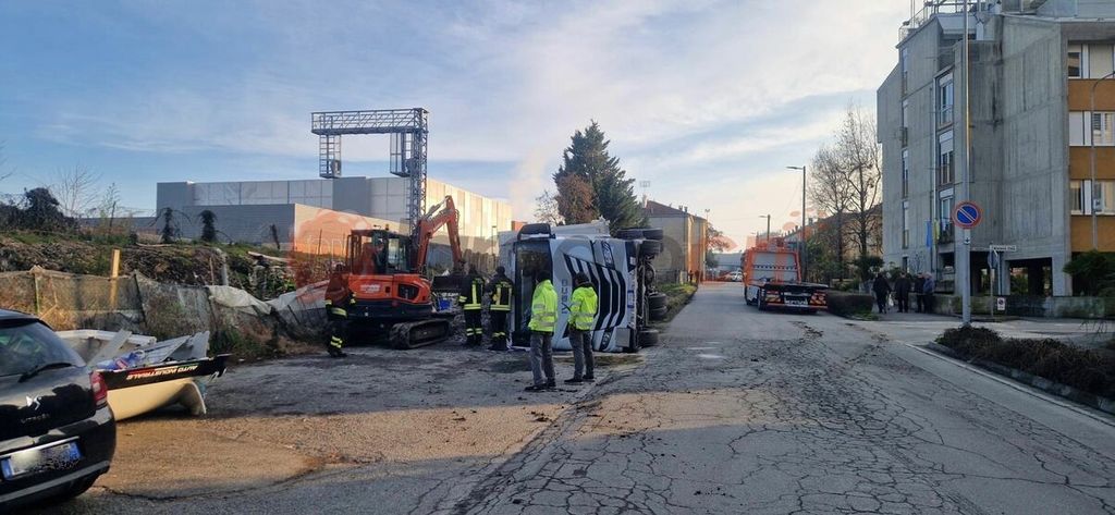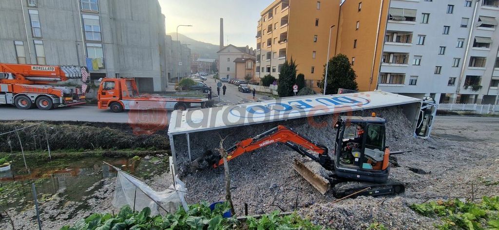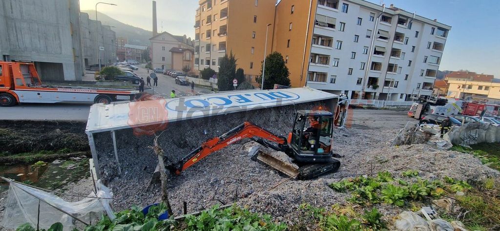 L’intervento è terminato in tarda serata verso le 22.00 con la rimozione del complesso veicolare carico ribaltatosi.