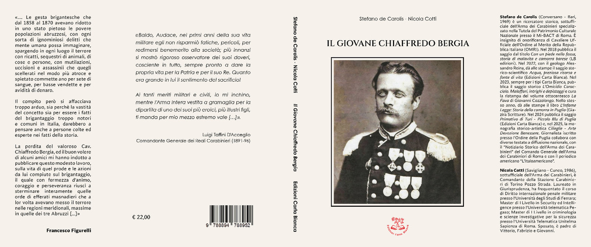 “Il Giovane Chiaffredo Bergia” (Edizioni Carta Bianca), di Stefano de Carolis e Nicola Cotti, un saggio storico scritto per rendere omaggio a uno degli eroi più decorati dell’Arma dei Carabinieri, esplorandone la vita prima del suo arruolamento nel Corpo dei Reali Carabinieri, attraverso documenti e fotografie inedite, e importanti testimonianze familiari.