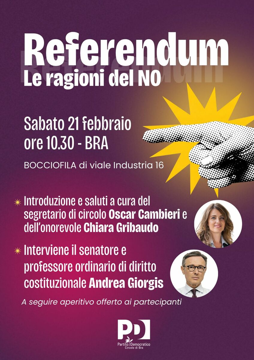 Sabato 21 febbraio, a Bra, si parlerà di referendum e Costituzione con voci di assoluto livello: il senatore Andrea Giorgis, docente di Diritto costituzionale, e la vicepresidente del PD, on. Chiara Gribaudo.