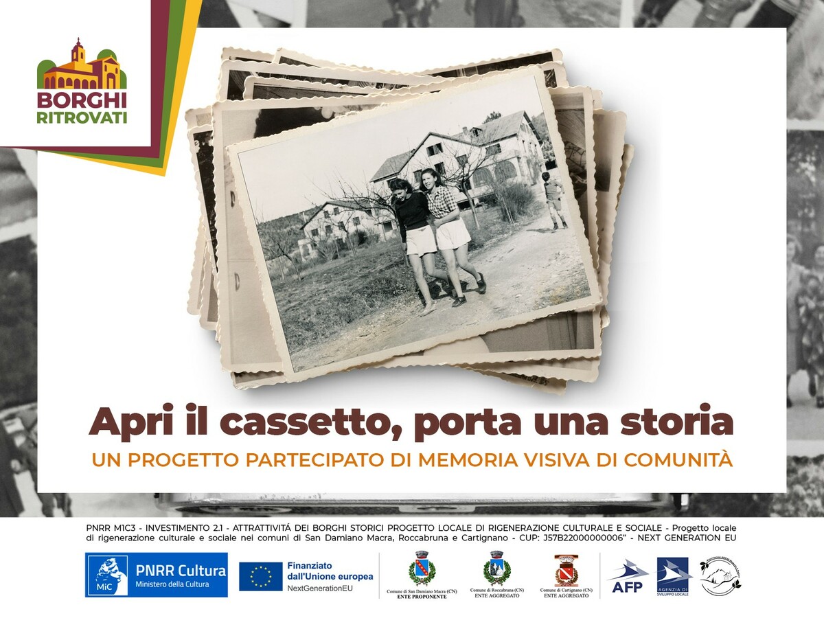 Si intitola Apri il cassetto, porta una storia: un progetto partecipato di memoria visiva di comunità la nuova iniziativa sviluppata e avviata nell'ambito del progetto Borghi ritrovati sostenuto dal PNRR (M1C3 – Investimento 2.1 – Attrattività dei borghi storici progetto locale di rigenerazione culturale e sociale – Progetto locale di rigenerazione culturale e sociale nei Comuni di San Damiano Macra, ente proponente, Roccabruna e Cartignano, enti aggregati).