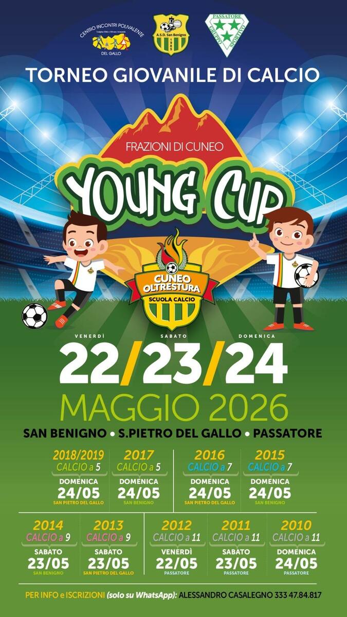 Mancano meno di 100 giorni alla Young Cup 2026 e, se c’è un evento che a Cuneo sa trasformare il calcio giovanile in una festa vera, è proprio questo. Dal 22 al 24 maggio 2026 le frazioni si accendono: San Benigno, San Pietro del Gallo e Passatore diventano un unico grande campo diffuso, con tribune piene di famiglie, sorrisi, tifo pulito e bambini che corrono dietro a un pallone con l’unica cosa che conta: giocare.