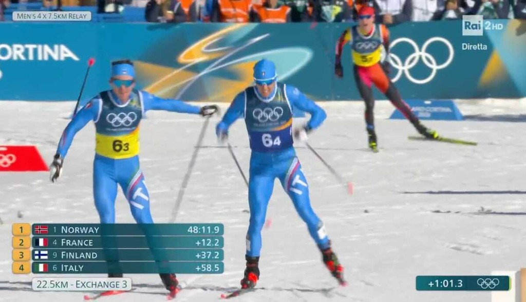 A vincere è stata la fortissima Norvegia (Iversen, Nyenget, Hedegart, Klaebo) con il fuoriclasse Klaebo che ha dovuto solamente gestire l’ottimo vantaggio procurato dai compagni. Piazza d’onore per la Francia (Schely, Lapalus, Desloges, Lovera) che dopo un inizio in sordina abbandona la concorrenza in terza frazione con il giovane Desloges e chiude a 22 secondi. Terza moneta appunto per l’Italia, a 47.9 dai vincitori. Finisce ai piedi del podio la Finlandia (Vuorinen, Niskanen, Ruuskanen, Anttola) che chiude a soli 10 secondi dagli italiani.