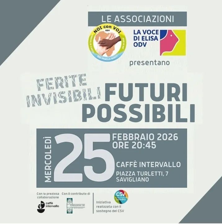 Mercoledì 25 febbraio 2026, alle ore 20.45, presso il Caffè Intervallo di Savigliano (Piazza Turletti 7), si terrà la serata “Ferite invisibili, futuri possibili”, un incontro di riflessione e approfondimento dedicato al trauma infantile e alla resilienza dell’essere umano.