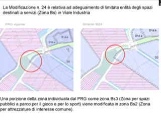 La modificazione n. 24 riguarda un’area di viale Industria situata nei pressi della nuova rotatoria. Si tratta di una porzione classificata come zona Bs3, destinata a “spazi pubblici a parco per il gioco e per lo sport”, che viene ricondotta alla più opportuna definizione di “zona per attrezzature di interesse comune”. Un dettaglio che fa la differenza, ma non produce alcun cambiamento sostanziale.