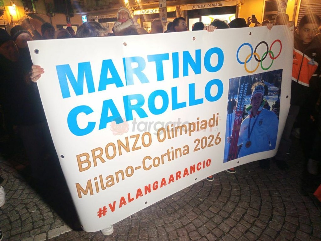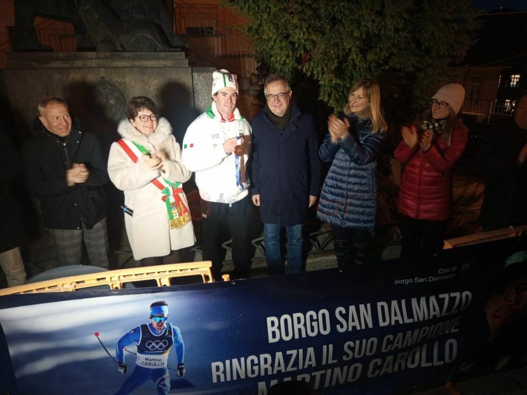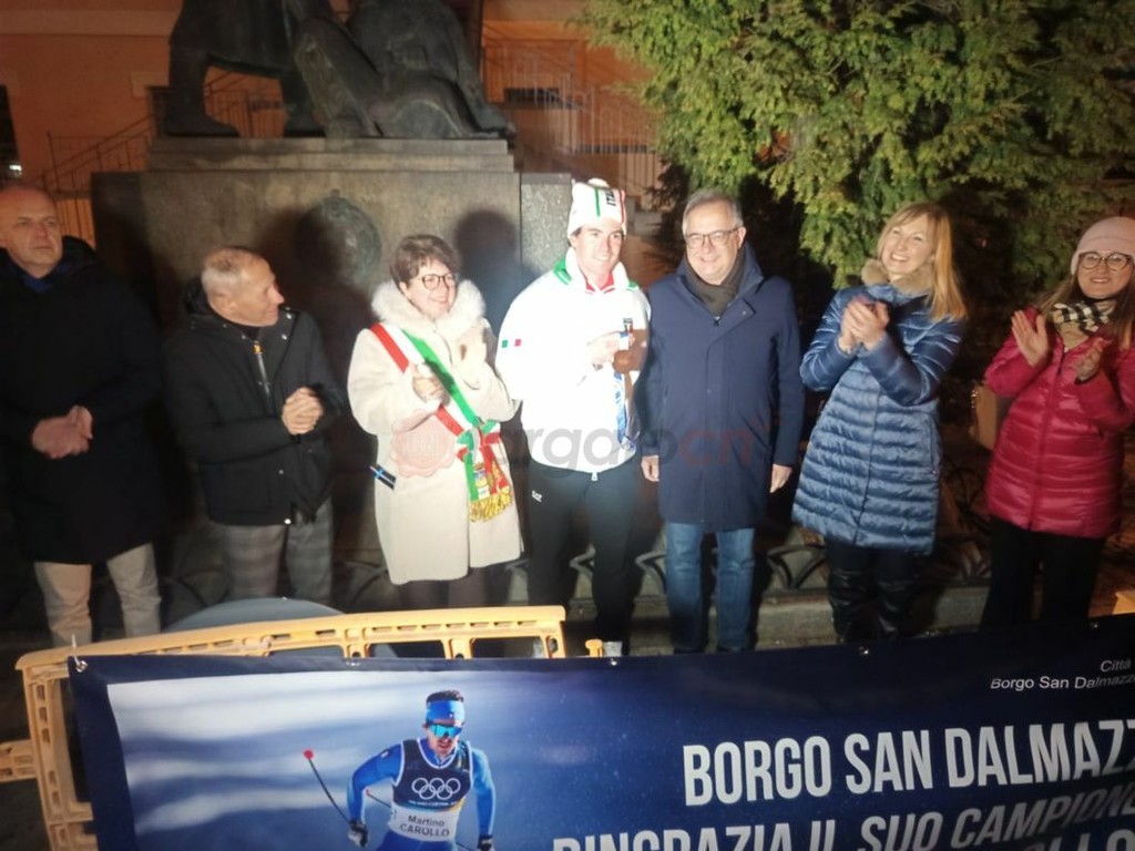 Accoglienza da star, giovedì 19 febbraio, per Martino Carollo, tornato nella sua Borgo San Dalmazzo dopo l'entusiasmante esperienza di Milano Cortina.