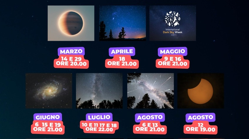 Tra gli appuntamenti principali figurano l'osservazione di Giove, delle galassie della Vergine e la partecipazione alla Dark Sky Week. Ad agosto l’evento dell’Eclisse Parziale di Sole (12 agosto, ore 19:28) e il picco delle Perseidi.