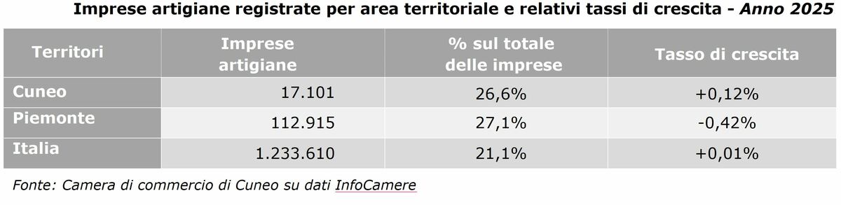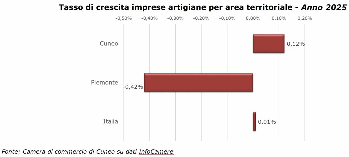 La dinamica del comparto artigiano cuneese è in linea rispetto a quella dell’intero tessuto imprenditoriale locale, che ha visto chiudere il 2025 con un tasso di crescita del +0,11%, e migliore rispetto alla tendenza del comparto a livello regionale (-0,42%) e nazionale (+0,01%).