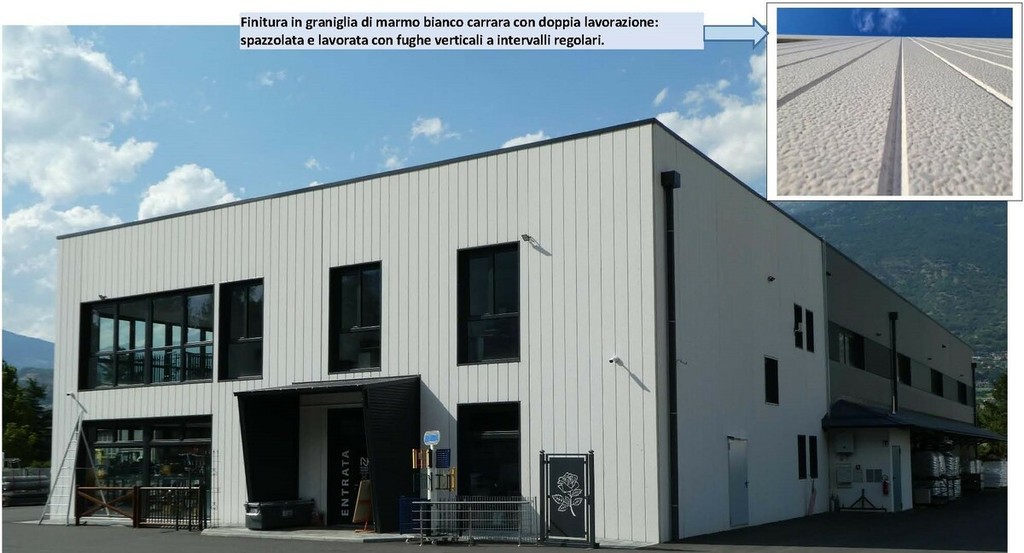 Di particolare pregio e di indubbio effetto architettonico sono poi le superfici levigate, spazzolate, martellinate, cannettate e lavorate con fughe realizzate con un innovativo macchinario a lavorazione verticale che permette di realizzare soluzioni semplici ma di indubbia qualità architettonica.