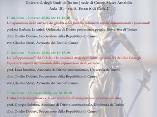 Prenderà il via lunedì 2 marzo, nella sede di Cuneo dell’Università degli Studi di Torino, il ciclo di incontri seminariali dedicato al progetto di riforma costituzionale della magistratura, un tema destinato a incidere in profondità sugli assetti ordinamentali e sull’equilibrio tra poteri dello Stato.