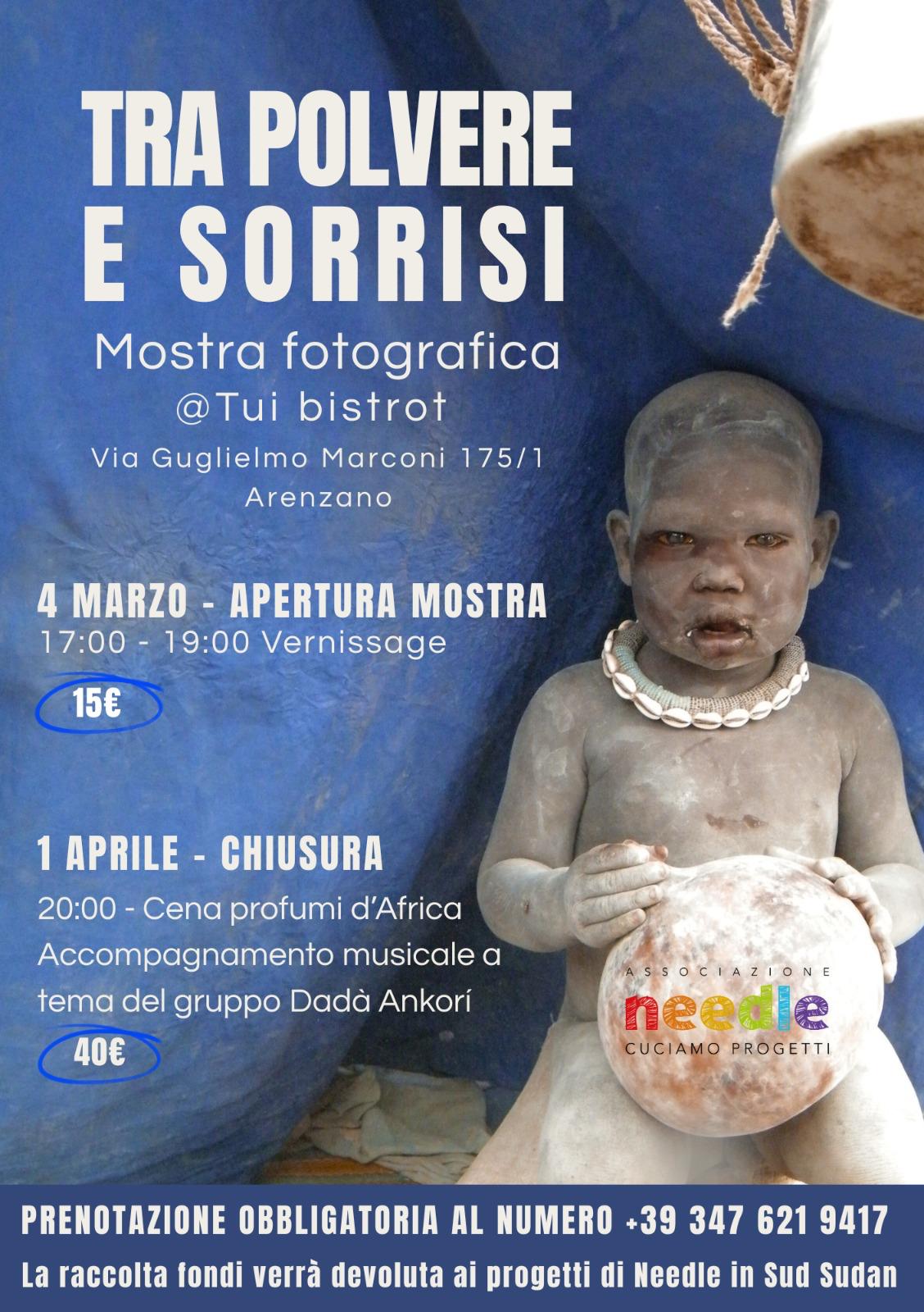 Dal 4 marzo al 1° aprile, presso il ristorante Tui Bistrot di Arenzano, sarà visitabile negli orari di apertura del locale, la mostra fotografica “Tra polvere e sorrisi”, organizzata da Needle, associazione senza fini di lucro impegnata nella realizzazione di interventi di solidarietà e sostegno in Sud Sudan, uno degli Stati più poveri del continente africano.