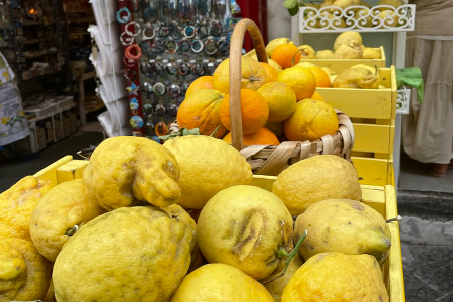 Ogni metro è stato utilizzato. Amalfi non è ampia. È concentrata tra una salita e l’altra compaiono i limoni. Crescono su terrazze sostenute da muri a secco che trattengono la terra contro la pendenza. Sono grandi, irregolari, con la buccia spessa. Il profumo è netto. Il limone non è un semplice prodotto, ma un elemento strutturale dell’economia e dell’immaginario collettivo. Ha modellato il paesaggio e orientato per secoli scambi commerciali e pratiche agricole.