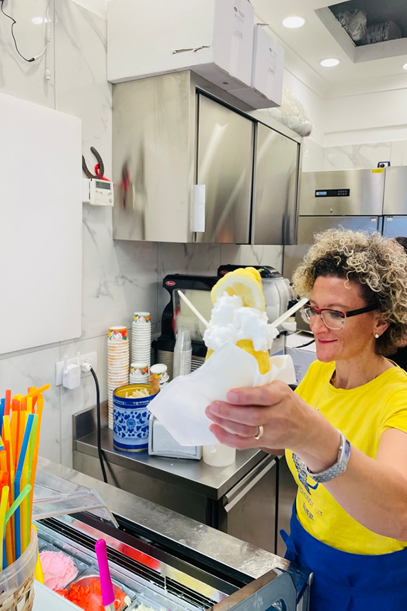 La sua presenza si traduce in una filiera che va dalla vendita diretta alle sue trasformazioni. Nel tessuto urbano questa identità si condensa in una preparazione essenziale: la granita. Nei bar affacciati sulla piazza, il succo fresco viene mescolato a ghiaccio tritato, senza artifici. È una risposta concreta al caldo e alla fatica. Fresca, diretta, intensa, restituisce energia e racconta il rapporto tra coltivazione e consumo. In un territorio che impone adattamento continuo, anche il ristoro segue una logica di semplicità funzionale.