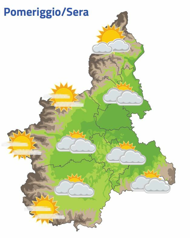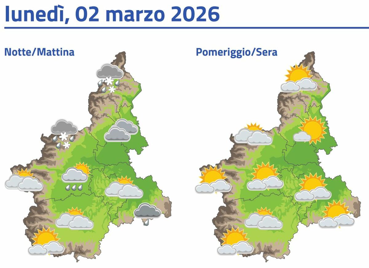 Il quadro migliorerà gradualmente a partire da lunedì pomeriggio, quando una rimonta dei valori di pressione sul Mediterraneo centrale porterà cieli più soleggiati. Lunedì persisterà ancora un cielo nuvoloso con precipitazioni deboli o moderate al mattino, specialmente nel Piemonte settentrionale, che andranno attenuandosi da metà giornata fino all'esaurimento, con quota neve sui 1400-1600 metri. venti saranno generalmente deboli, sudoccidentali al mattino con successiva rotazione da ovest sulle Alpi, variabili altrove.