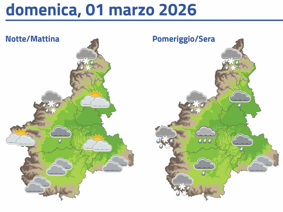 Domani, tuttavia, la situazione cambierà radicalmente. Domenica 1° marzo sono infatti previsti rovesci inizialmente sparsi e deboli sulla fascia pedemontana alpina, che si intensificheranno progressivamente fino a diventare moderati o localmente forti tra il tardo mattino e la mattina successiva. I fenomeni si estenderanno alle pianure nel corso del pomeriggio. La quota neve è stimata tra i 1400 e i 1700 metri. I venti soffieranno deboli o localmente moderati sudoccidentali sulle Alpi, mediamente deboli altrove, tra sud e sud-est sull'Appennino, orientali sui restanti settori.