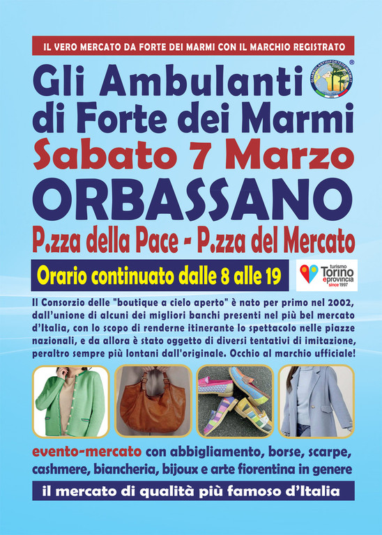 Si comincia a pensare al “cambio di stagione” e dunque arriva propizia la presenza de Gli Ambulanti di Forte dei Marmi®, le bancarelle del mercato di qualità più famoso d’Italia (da non confondere con alcuni tentativi di imitazione del loro originale format che circolano in regione), che, dopo tanti successi in giro per la Penisola, tornano a grandissima richiesta nel Torinese con il loro show itinerante, all’insegna del meglio del Made in Italy artigianale e delle ultime tendenze della moda. Si potranno infatti ammirare le ormai mitiche boutique a cielo aperto® dell’originale Consorzio sabato 7 marzo ad ORBASSANO, in Piazza della Pace (la piazza del mercato), per un’iniziativa come sempre attesissima. Dunque, un’occasione da non perdere assolutamente per le legioni di fedeli fans del Consorzio che l’hanno a lungo reclamata: come sempre, una rassegna dello shopping più glamour e conveniente, con orario continuato, anche in caso di maltempo, dalle 8 alle 19.