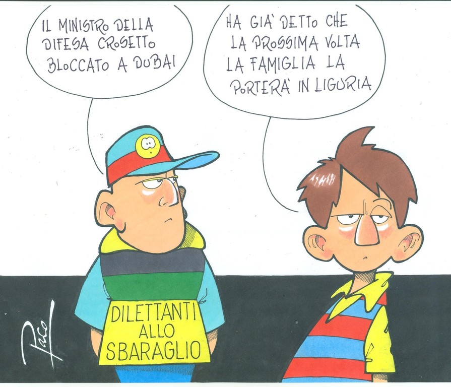 Il nostro Ministro della Difesa Crosetto è bloccato a Dubai. Perchè? Perchè lì piovono razzi, missili, droni, bombe...insomma l'Iran s'è un po' incazzato dell'attacco congiunto USA-Israele che ha ucciso il Capo Supremo Ali Khamenei. Il Ministrone che ne sapeva? Il Governo della Giorgia Meloni mica è stato avvertito da Trump del probabile attacco. Lo sapevano tutti, lo sapeva anche il mio vicino di casa...ma Giorgia no. In fin dei conti Trump aveva detto che la Meloni era una bella gnocca, mica che contava qualcosa.