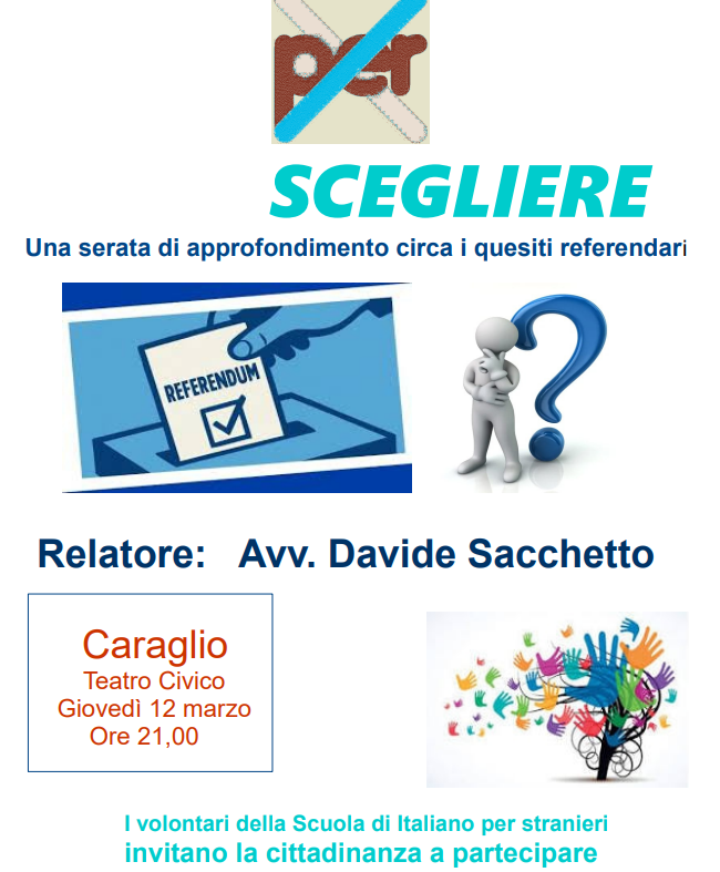 I volontari della scuola di italiano per stranieri promuovono una serata informativa sul referendum. Certi che sia importante esercitare un proprio diritto di cittadini attivi partecipando alla consultazione popolare attraverso il proprio voto, siamo altresì convinti che per scegliere consapevolmente è necessario sapere di che cosa trattino i vari quesiti su cui si è chiamati a dirsi se contrari o favorevoli.