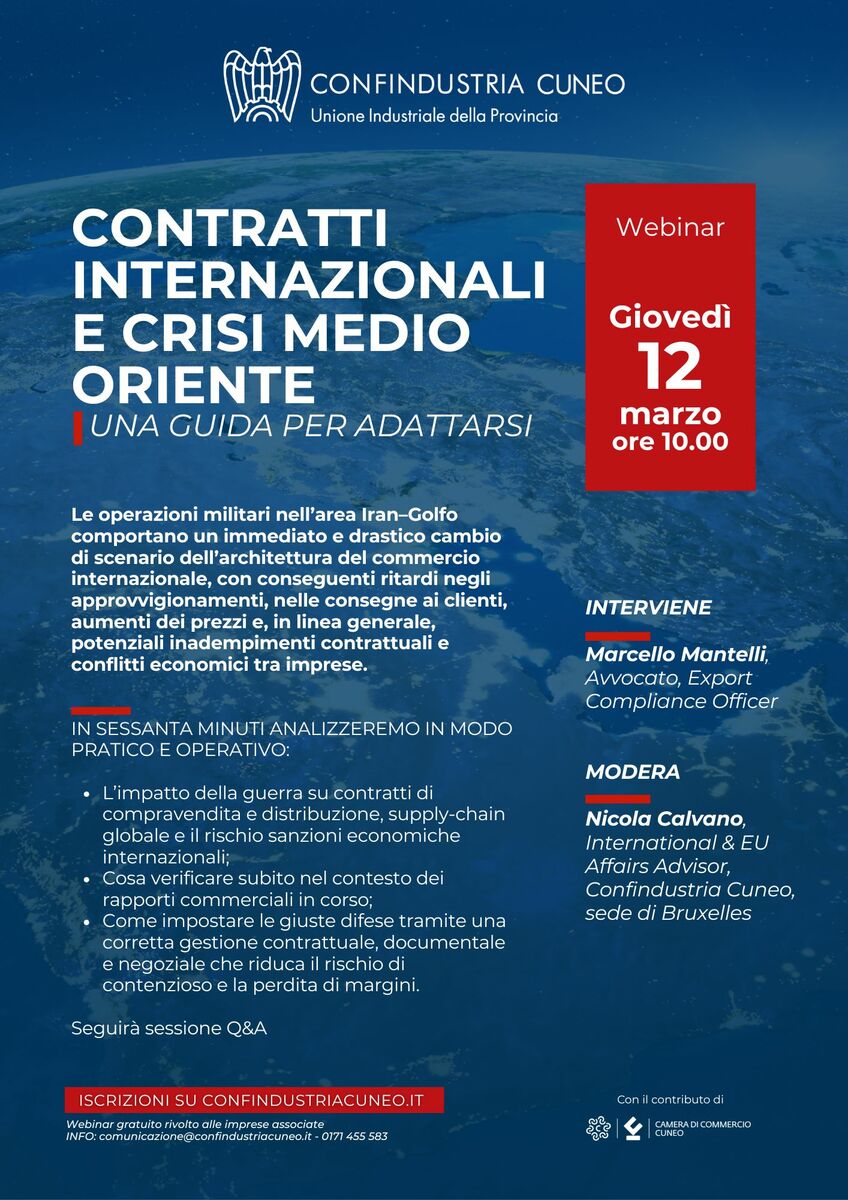 Accanto all’informazione continua, tra le prime azioni operative sono previsti webinar dedicati alle esigenze più immediate delle imprese. Il primo, “Contratti internazionali e crisi Medio Oriente: una guida per adattarsi”, si terrà giovedì 12 marzo alle 10 e affronterà in chiave pratica l’impatto del conflitto sui contratti di compravendita e distribuzione, sulle supply chain globali, sul rischio di sanzioni economiche e su cosa verificare subito nei rapporti commerciali in corso. Interverrà l’avvocato Marcello Mantelli e modererà Nicola Calvano, International & Eu Affairs Advisor di Confindustria Cuneo – sede di Bruxelles.