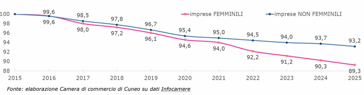 L’analisi dei dati evidenzia come le imprese femminili abbiano sofferto in maggior misura delle criticità registrate dal sistema imprenditoriale nel suo complesso perdendo, nell’arco di un decennio, oltre 1.700 aziende che si traducono in una flessione del 10,7%. Nel 2025 la variazione rispetto all’anno precedente è stata del -1,1% più marcata rispetto al dato piemontese (-0,4%) e a quello nazionale (-0,3%).