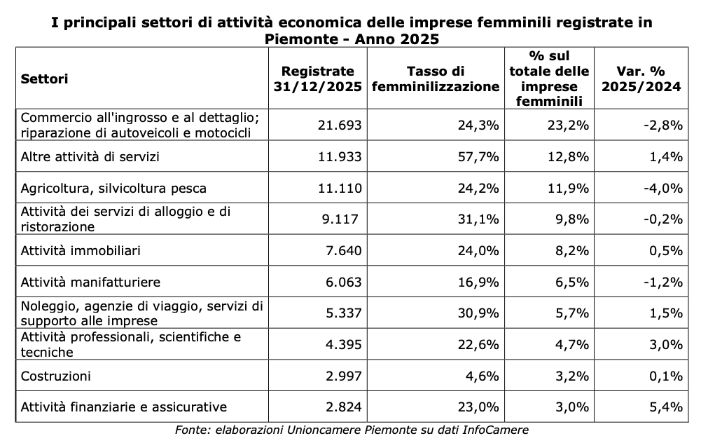 Ciononostante, le risultanze del Registro Imprese delle Camere di commercio piemontesi delineano per il 2025 una nuova, seppur lieve, flessione: la compagine guidata da donne ha, infatti, perso 416 unità rispetto al 2024, segnando una contrazione dello 0,4%.
