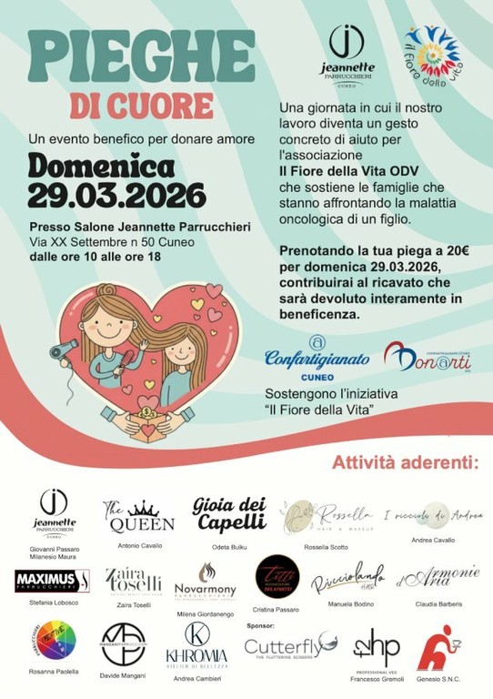 Quattordici parrucchiere e parrucchieri di Cuneo e dintorni uniti per la solidarietà. Domenica 29 marzo si svolgerà l’evento “Pieghe di cuore”, organizzato da Jeannette Parrucchieri (in via XX Settembre 50 a Cuneo) in collaborazione con l’associazione “Il Fiore della Vita Odv”, realtà nata nel 2011 che si occupa di sostenere i bambini che affrontano percorsi di cura oncologici e le loro famiglie. Durante la giornata, con orario continuato dalle ore 10 alle ore 18, i parrucchieri e le parrucchiere aderenti offriranno pieghe al prezzo di 20 euro: l’intero ricavato, comprese le altre eventuali ulteriori offerte, sarà devoluto all’associazione.