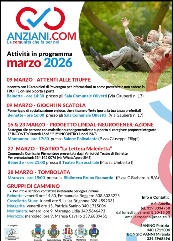L'iniziativa, promossa attraverso il progetto intercomunale Anziani.com, che coinvolge i territori di Beinette, Margarita, Morozzo, Montanera e Castelletto Stura, con il coordinamento del Consorzio Socio Assistenziale Cuneese (CSAC), ha visto l'intervento del maresciallo Gabriele Pirillo, Comandante della Stazione dei Carabinieri di Peveragno, che ha illustrato alla cittadinanza le più frequenti strategie di truffa, dai raggiri porta a porta fino alle insidie che corrono sui social e al telefono.