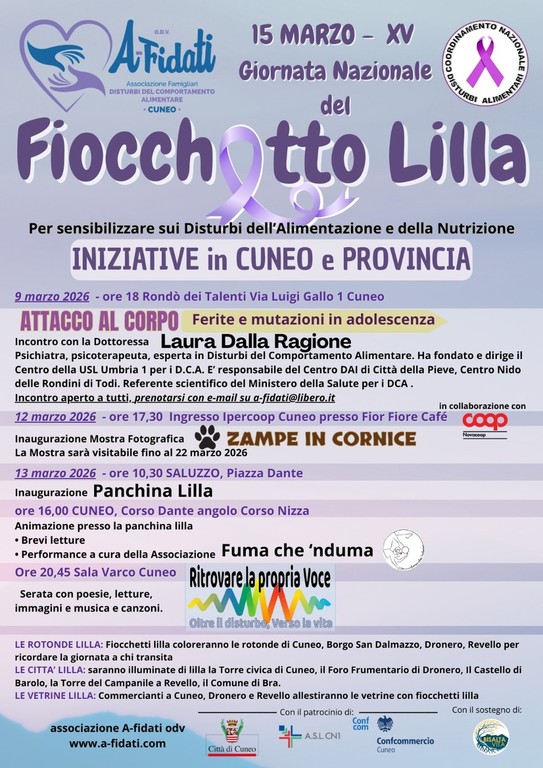 In occasione della Giornata del Fiocchetto Lilla, in calendario domenica 15 marzo, l’associazione A-Fidati (Associazione famigliari disturbi del comportamento alimentare) insieme al Coordinamento nazionale disturbi alimentari organizza una serie di eventi su questo tema.