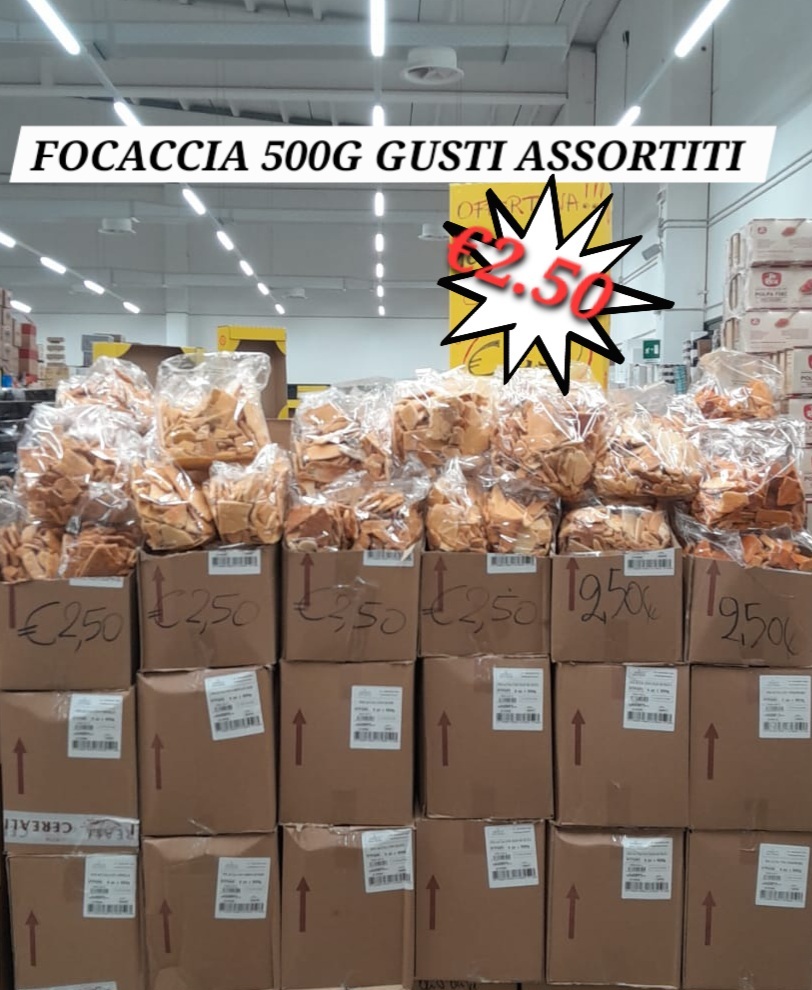 ● Focaccia 500 g – gusti assortiti → €2.50 Sì, hai letto bene! Il prezzo torna quello di prima! Disponibile nei gusti: olio d’oliva, pomodoro, cipolla, mais e olive.