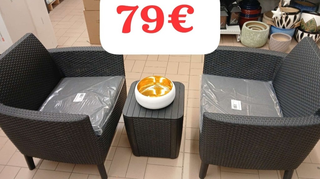 - Salottino per due persone → €79.00 Composto da 2 poltrone e un tavolino, ideale per piccoli spazi senza rinunciare a comodità ed eleganza.