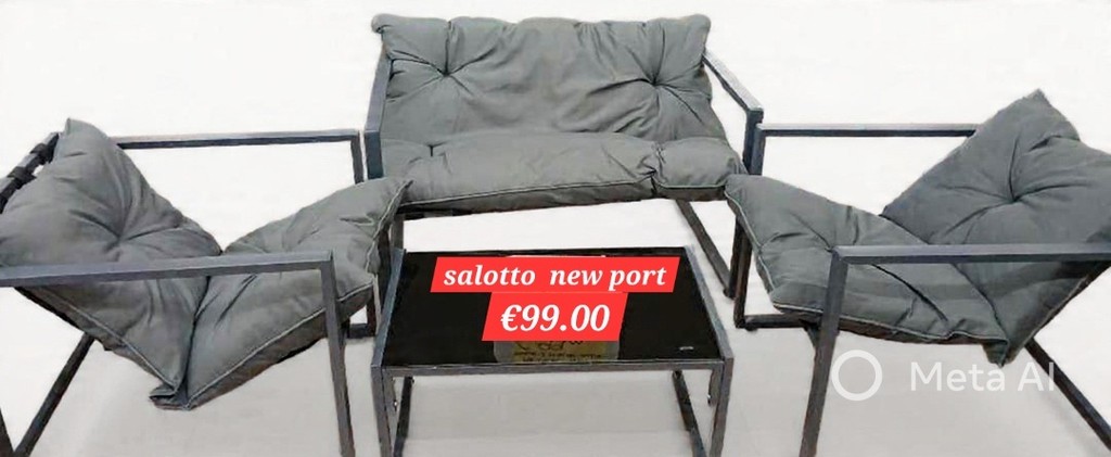 - Salotto “NewPort” in metallo → €99.00 Elegante set da esterno composto da 2 poltrone con cuscini, 1 divanetto con cuscino e 1 tavolino. Perfetto per arredare con stile giardini, terrazzi e spazi all’aperto.