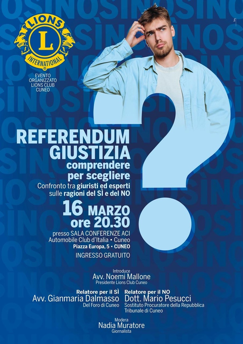 Lunedì 16 marzo 2026, alle ore 20:30, presso la Sala Olivero, dell’Automobile Club d’Italia di Cuneo, sita in Piazza Europa n. 5, il Lions Club Cuneo organizza il convegno dal titolo “Referendum giustizia: comprendere per scegliere”.