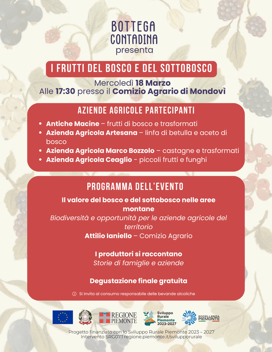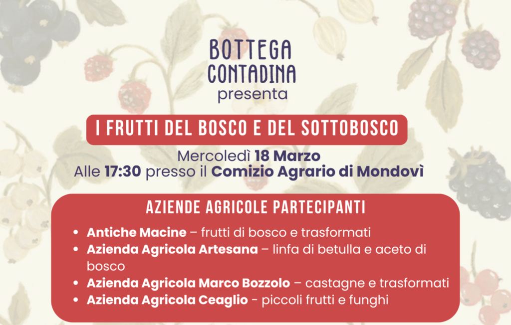 Prosegue il ciclo di incontri del Progetto Bottega Contadina, dedicato alla valorizzazione delle produzioni locali e della filiera corta del territorio monregalese. Il prossimo appuntamento è in programma mercoledì 18 marzo alle ore 17:30 presso il Comizio Agrario di Mondovì, con un incontro dedicato al tema “I frutti del bosco e del sottobosco”.