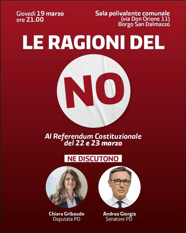 In vista dell’imminente appuntamento referendario di domenica 22 e lunedì 23 marzo, il Partito Democratico organizza un incontro a Borgo San Dalmazzo per illustrare le ragioni del No.