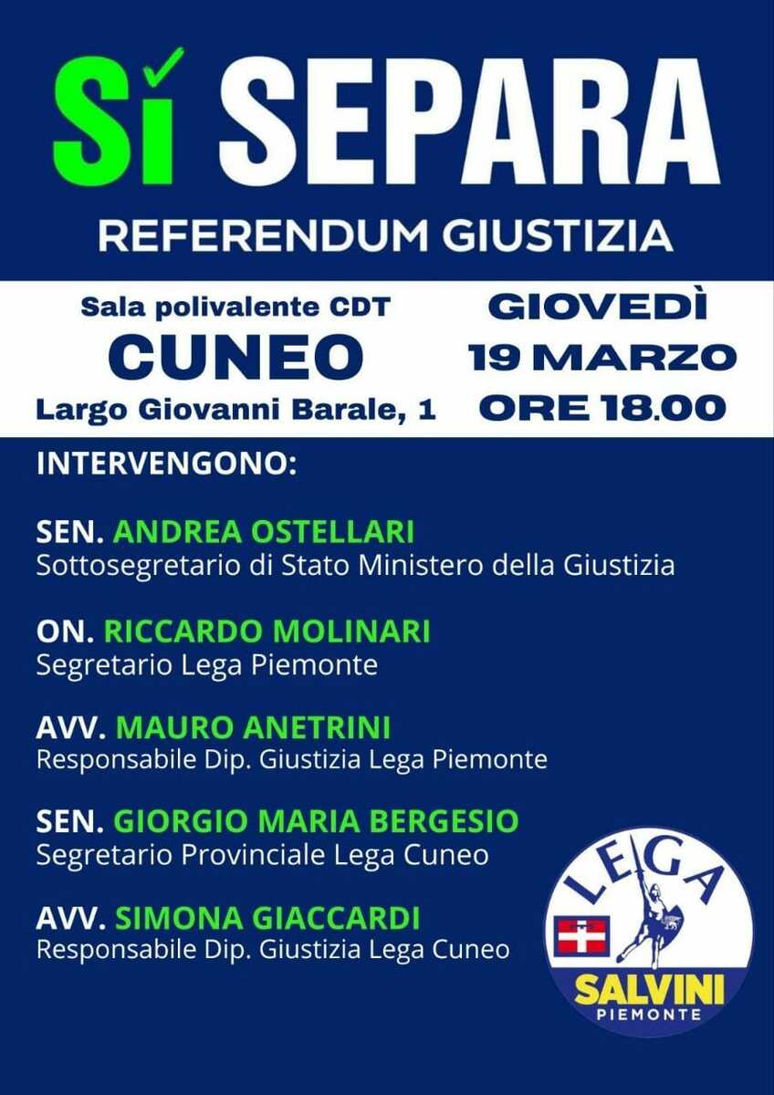 Il 19 marzo prossimo alle ore 18 presso la Sala CDT a Cuneo (Largo Barale 1) la Lega cuneese organizza un incontro riguardante la campagna referendaria per il Sì che vedrà quali ospiti il Sottosegretario alla Giustizia Sen. Andrea Ostellari, il Capogruppo Lega alla Camera On. Riccardo Molinari, l'avvocato Mauro Anetrini (Responsabile Dipartimento Giustizia Lega Piemonte), il Segretario Provinciale Lega Cuneo Sen. Giorgio Maria Bergesio e l'avvocato Simona Giaccardi (Responsabile Dipartimento Giustizia Lega Cuneo).