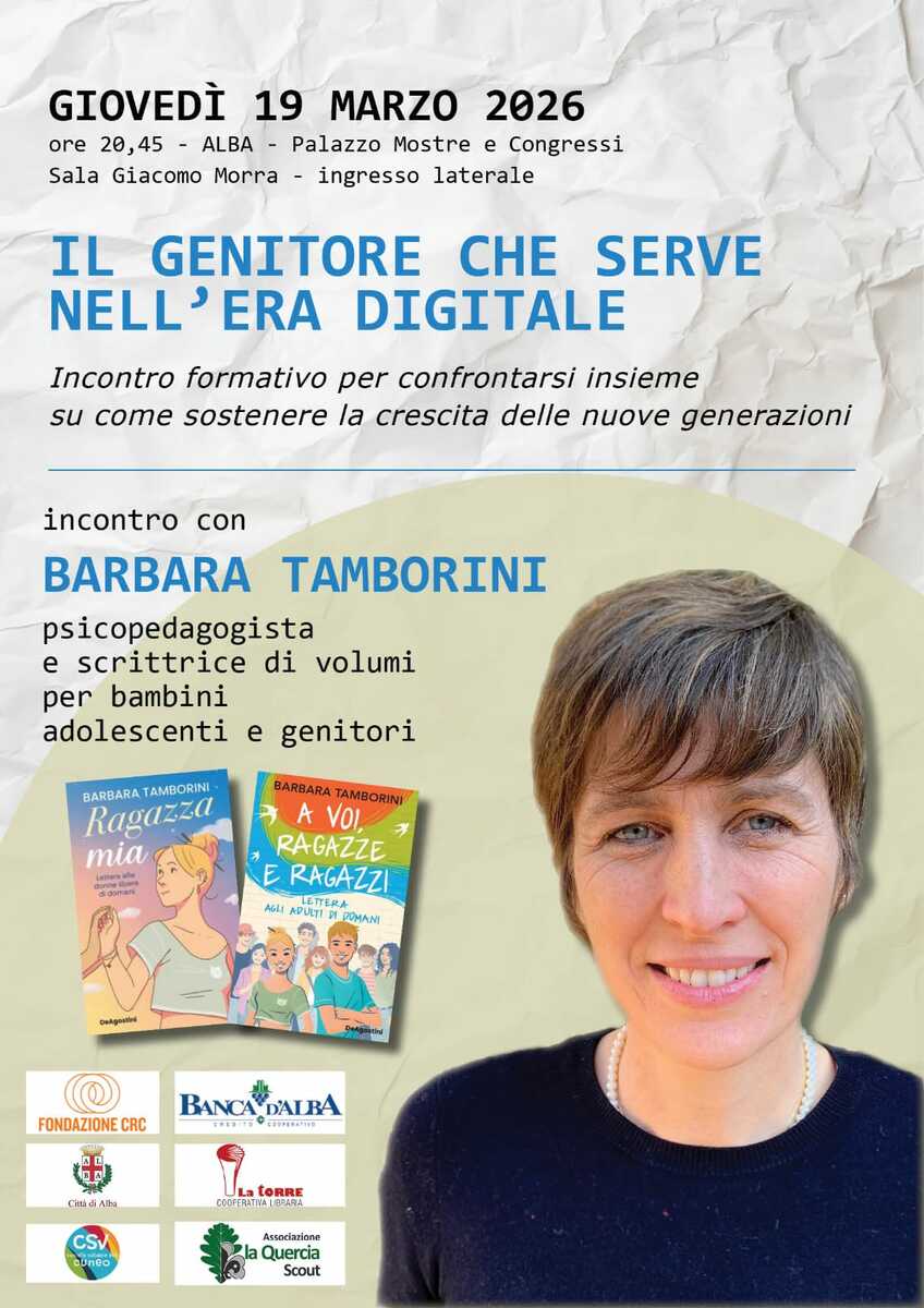 L’incontro sarà preceduto giovedì 19 marzo da una serata sugli stessi argomenti, o meglio più specifico sul mondo digitale con il titolo “Il genitore che serve nell’era digitale”, ma aperta appunto ai genitori e agli adulti, che si svolgerà presso il salone del Palazzo Mostre e Congressi in Alba in piazza Medford, alle ore 21.