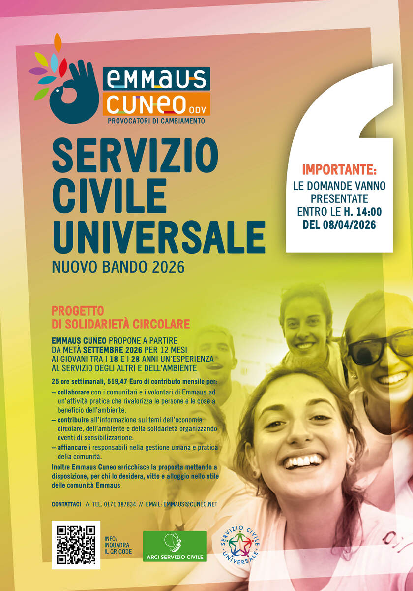 Emmaus Cuneo propone per il 2026 due iniziative per i giovani, la prima e la più imminente è la proposta di servizio civile all’interno della comunità, un’occasione di servizio che permette di fare un’esperienza arricchente e formativa nel campo dell’ecologia, dell’ambiente e dell’impegno sociale attraverso anche un’attività pratica di recupero e di riutilizzo, di coinvolgimento nelle iniziative di sensibilizzazione e di solidarietà a fianco delle persone della comunità.