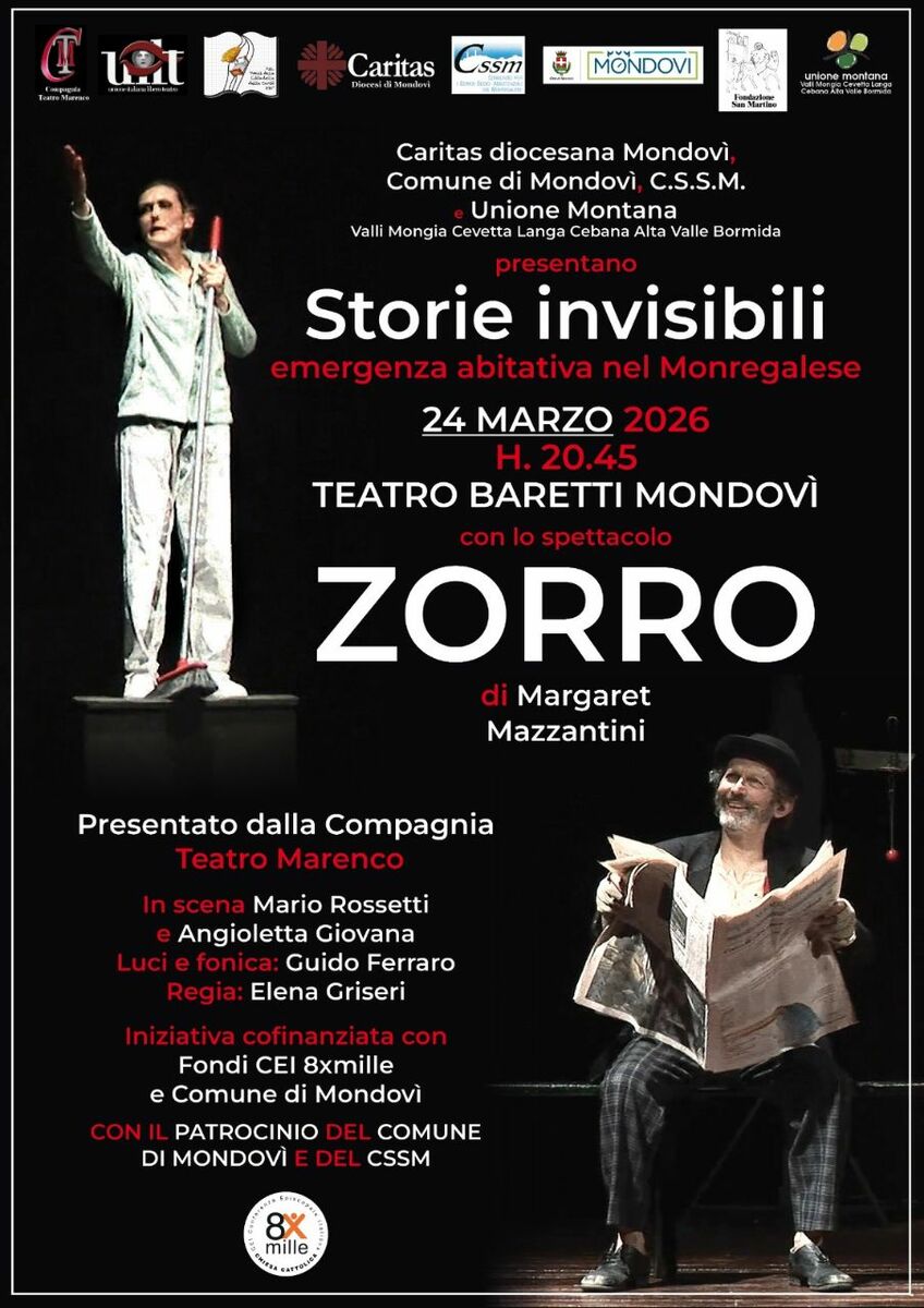 grazie alla collaborazione con la Compagnia Teatro Marenco di Ceva, andrà in scena l’atto unico “Zorro”, tratto da un romanzo breve di Margaret Mazzantini, che ripercorre le vicende che portano un uomo a vivere per strada, simbolo della vulnerabilità di molte persone che camminano su un piano inclinato che può farle precipitare nella condizione di non avere più una casa e una famiglia;
