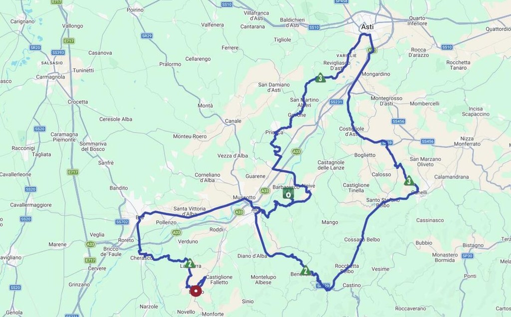 Dalle ore 13:49 a fine gara: località Altavilla, viale Cherasca, corso Nino Bixio, corso Torino, ponte Albertino, corso Canale, rotatoria Rondò, corso Bra, corso Unità d’Italia, direzione Monticello.