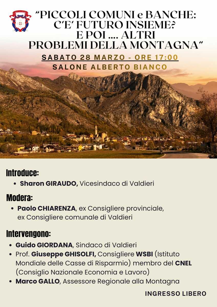 Sabato 28 marzo alle ore 17:00 Valdieri ospiterà un importante momento di confronto dedicato ai piccoli Comuni e, in particolare, alle sfide che interessano i territori montani. L’incontro, dal titolo “Piccoli Comuni e Banche: c’è futuro insieme? E poi… altri problemi della montagna”, si terrà a Valdieri con ingresso libero al salone Alberto Bianco.