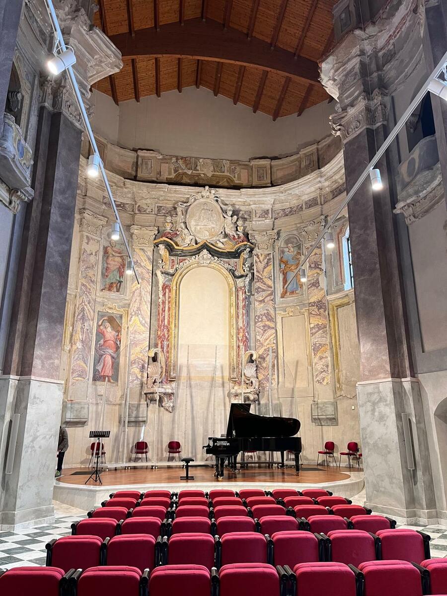 In particolare, i lavori hanno previsto l’installazione di una struttura riflettente amovibile (“camera acustica”) nell’area dell’abside, che ha migliorato la propagazione del suono tra i diversi volumi della sala. Sono stati inseriti pannelli fonoassorbenti ed elementi fonodiffondenti integrati sulle pareti, progettati nel rispetto dell’estetica dell’edificio. Accanto a questo è stato completamente rinnovato l’impianto audio. Tutto ciò nel più rigoroso rispetto delle caratteristiche storico-architettoniche della Sala, posta sotto tutela della Soprintendenza, con soluzioni reversibili e perfettamente integrate nel contesto esistente.