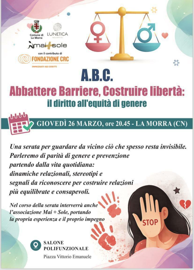 L’evento, dal titolo "A.B.C. Abbattere Barriere, Costruire libertà: il diritto all’equità di genere", si propone come un momento di riflessione condivisa per guardare da vicino ciò che spesso resta invisibile nelle pieghe della quotidianità.