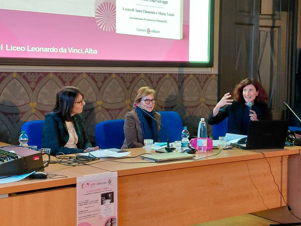 Nella sala polivalente del liceo “Leonardo da Vinci” di Alba si è svolta la presentazione del volume La Costituzione è donna. Le conquiste per la parità di genere dal 1946 ad oggi, pubblicato da Carocci nell’ottobre 2025 e curato da Anna Chimenti e Maria Natale. L’iniziativa, promossa dalla Consulta per le Pari Opportunità del Comune di Alba, si inserisce nel progetto “Verso l’80° anniversario del Voto alle Donne – Educare alla democrazia e alla parità”.