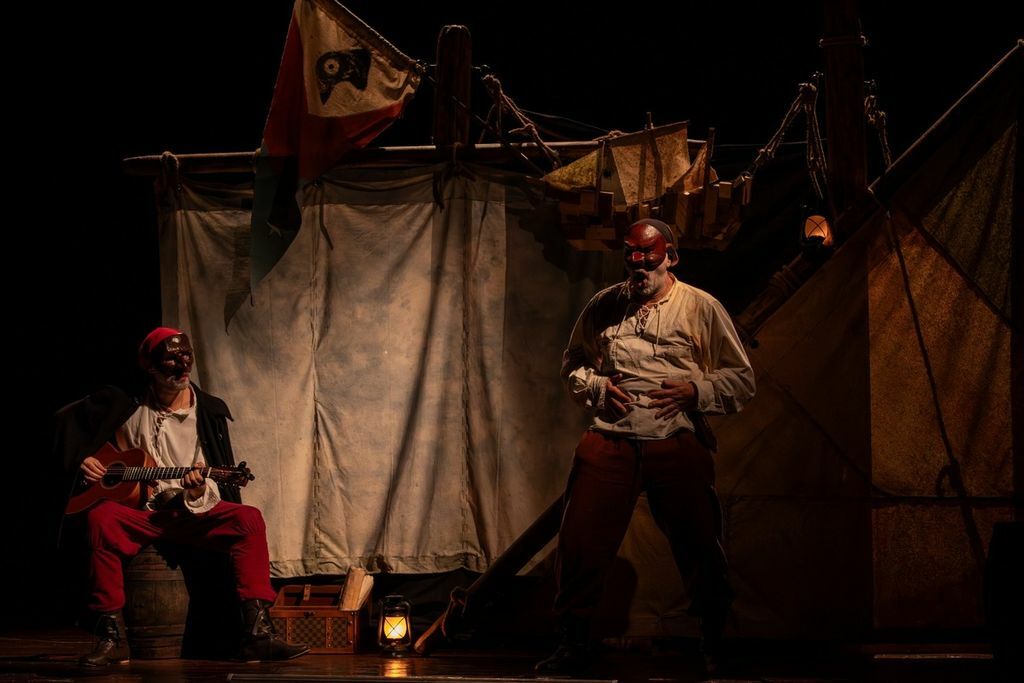 Il fedele Nostromo e una ciurma trovata per strada accompagneranno ser Piccione per mari tempestosi. Cosa troveranno all’approdo? La vera domanda è: cosa porteranno. L’obiettivo di Cristofaro Piccione, Nostromo e del loro equipaggio è esportare la democrazia, e così la Commedia dell’Arte incontra la critica ironica ai giorni che stiamo vivendo, nella speranza che, almeno per il tempo di una commedia, a squarciare il cielo sia il fragore delle risate e non il boato degli armamenti.