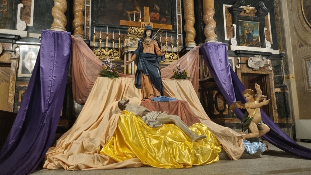 Drappi e composizioni floreali sempre nuovi e creativi avvolgono la scena di una toccante “Pietà”, incorniciata da stoffe policrome e ricreata con le statue lignee seicentesche della Madonna Addolorata e del Cristo morto, che sono un forte richiamo al sentimento di amore universale.