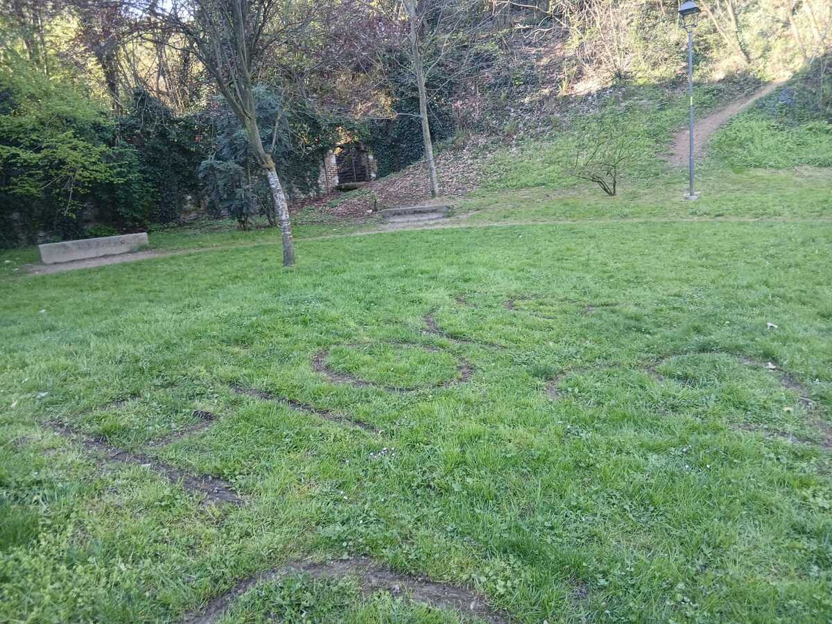 Sempre nel centro storico nei giardini Baden Powel, di fronte all’ex istituto d’arte, che è in attesa dell’intervento restaurativo per ospitare successivamente la scuola di formazione salesiana saluzzese Cnos Fap, l'aiuola verde centrale è stata scarificata per comporre una grande scritta, ben visibile dall’alto.