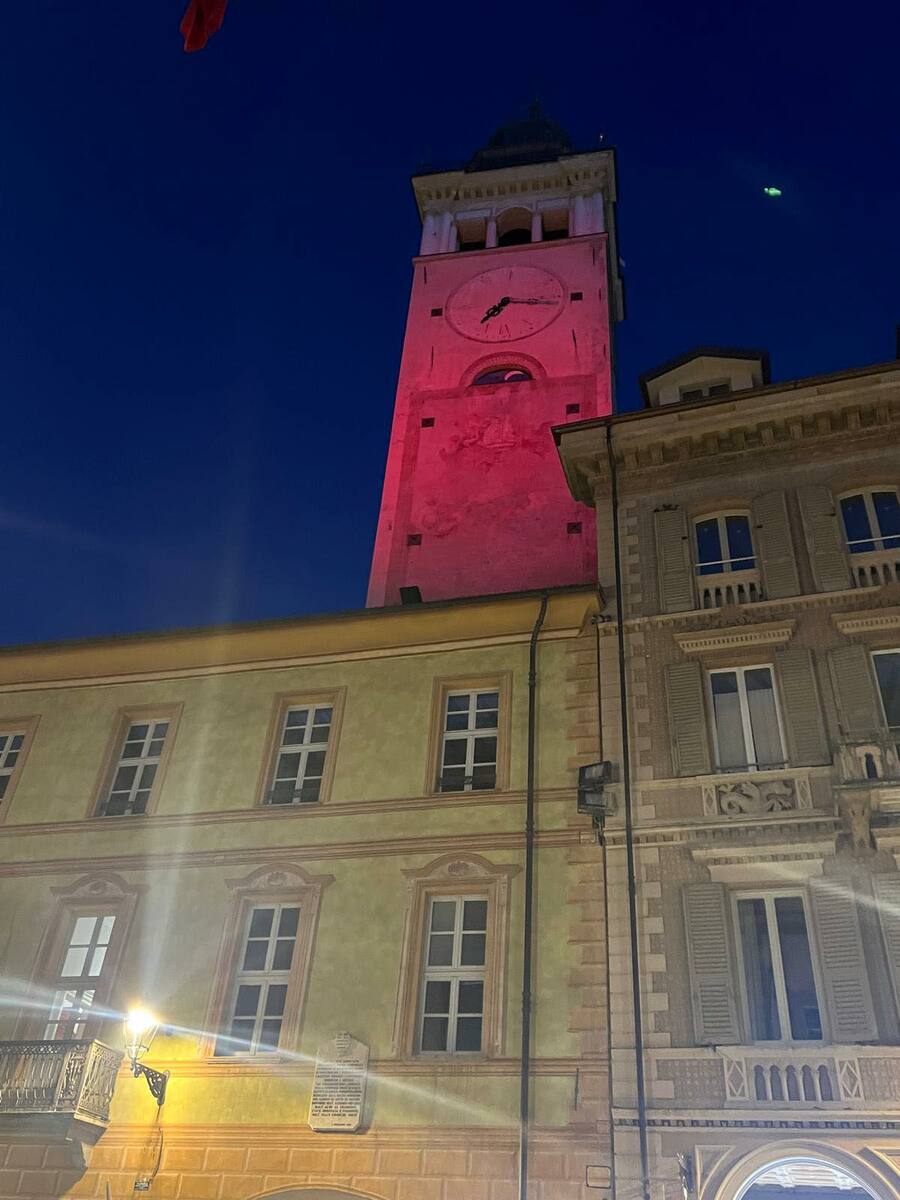 [La Torre Civica di Cuneo illuminata di rosso in occasione del “Mese internazionale del Mieloma”]
