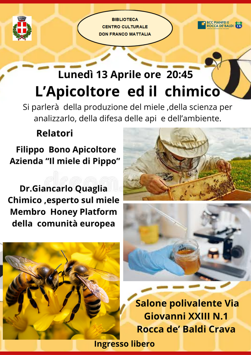 La Biblioteca “Don Franco Mattalia” propone un incontro dedicato alla scoperta dell’ecosistema delle api. L’evento, intitolato “L’Apicoltore e il Chimico”, si terrà lunedì 13 aprile 2025 alle ore 20:45 nel Salone Polivalente di via Giovanni XXIII n. 1, a Rocca de’ Baldi Crava.
