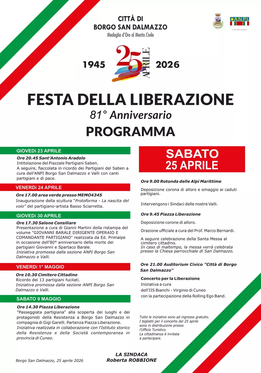 La Città di Borgo San Dalmazzo celebra l’81º Anniversario della Liberazione con un calendario di iniziative civili, culturali e commemorative in programma dal 23 aprile al 9 maggio, in collaborazione con la sezione ANPI Borgo San Dalmazzo e Valli e con il coinvolgimento di istituzioni e realtà del territorio.